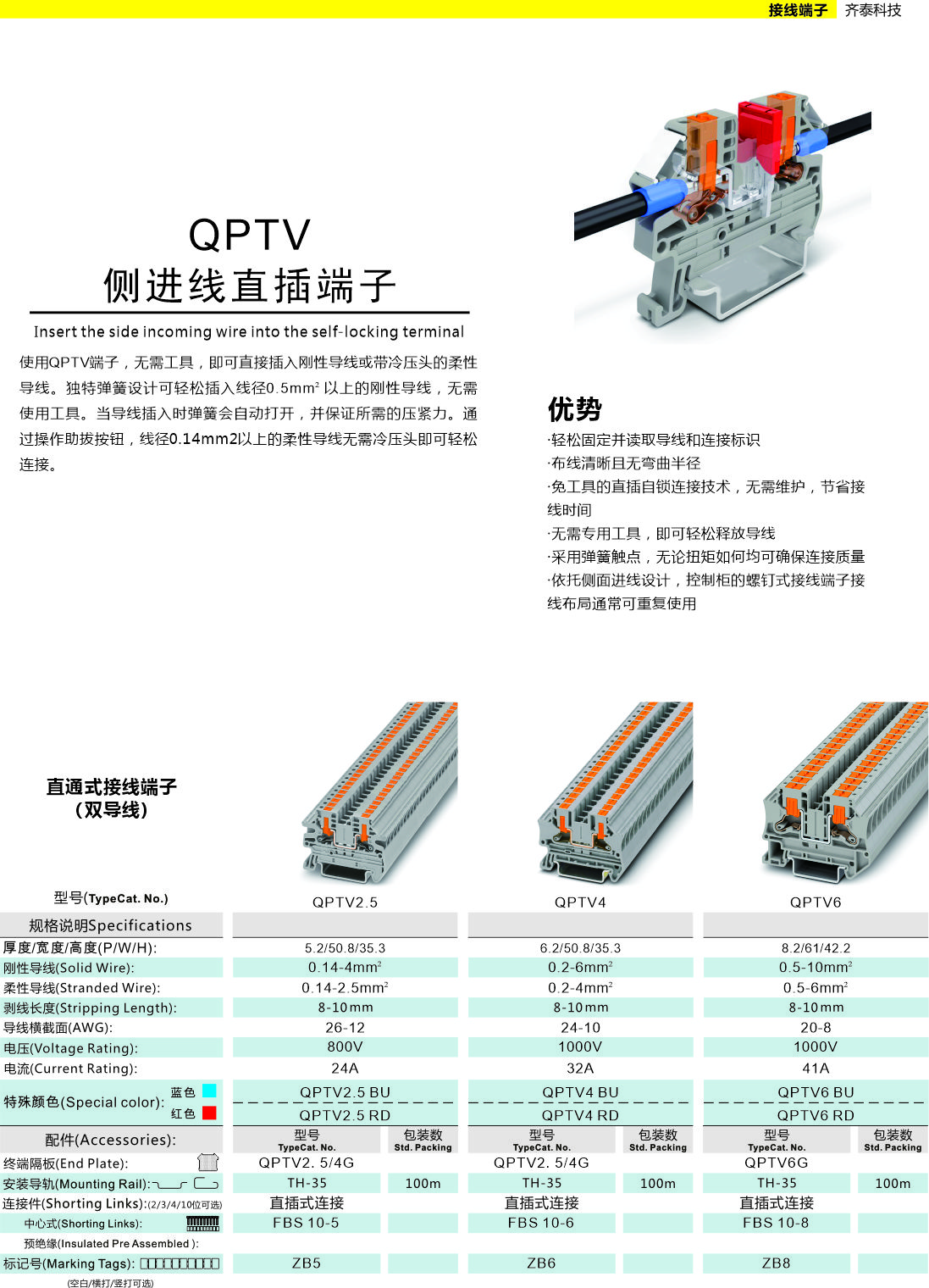 使用QPTV端子,无需工具,即可直接插入刚性导线或带冷压头的柔性