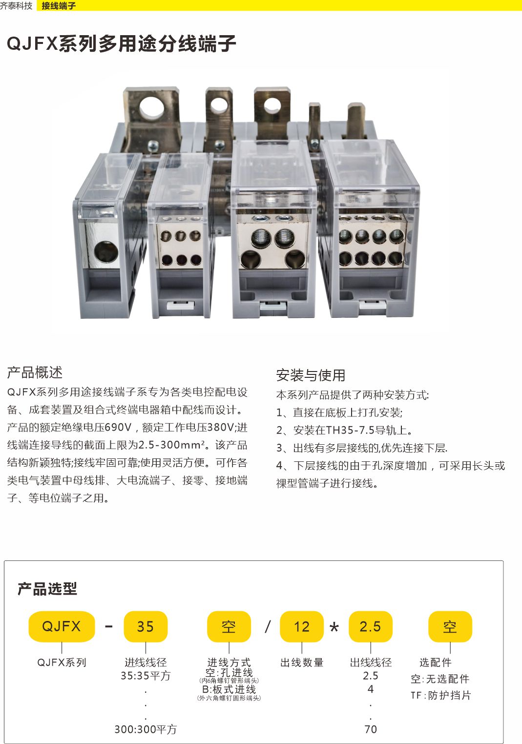 QJFX系列多用途接线端子系专为各类电控配电设备、成套装置及组合式终端电器箱中配线而设计。产品的额定绝缘电压690V,额定工作电压380V;进线端连接导线的截面上限为2.5-300mm²。该产品结构新颖独特;接线牢固可靠;使用灵活方便。可作各类电气装置中母线排、大电流端子、接零、接地端子、等电位端子之用。